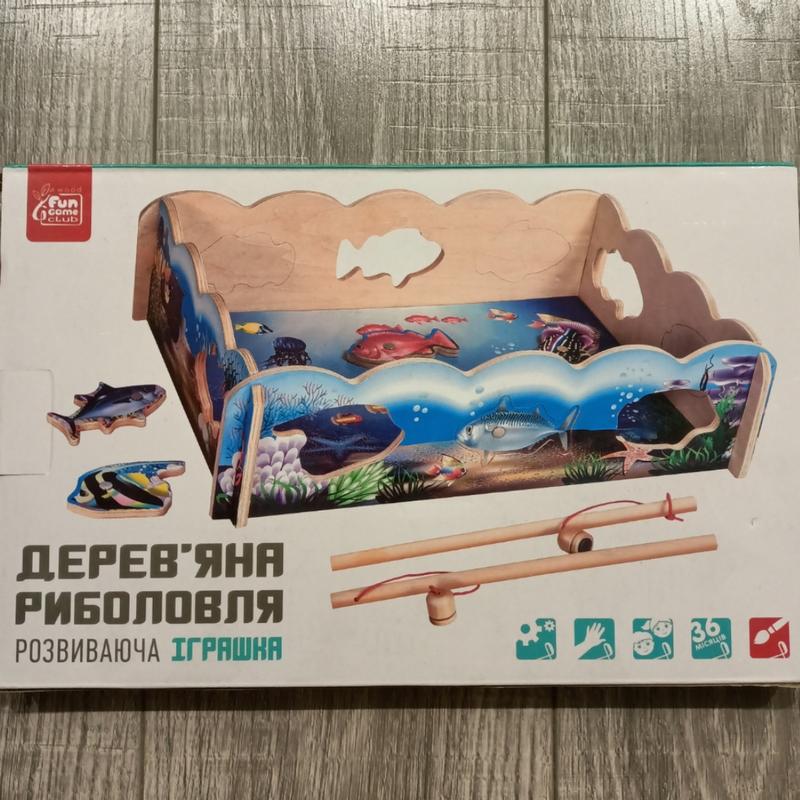 За допомогою дерев'яної магнітної риболовлі  Ваш малюк познайомиться з дивовижними мешканцями підводного світу. У комплектацію входить 4 складових елемента з яких можна буде спорудити невеликий чотирикутний басейн і запустити туди яскравих різнокольорових риб. Кожен мешканець підводного світу забезпечений невеликим магнітиком, розташованим посередині ігрової фігурки. На вудках замість гачків також передбачені дерев'яні елементи з магнітами. Варто малюкові спробувати виловити рибку, як його тут же чекає успіх. Також дану гру можна використовувати в якості сортера, завдяки наявності отворів на бортах "водойми".