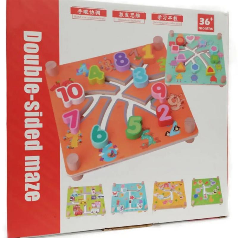 Двосторонній дерев'яний лабіринт зроблений у вигляді дошки з ніжками. Перша сторона навчає цифрам, інша — кольору, форми фігур. У набір входять пісочний годинник, можна вирішувати завдання на час
