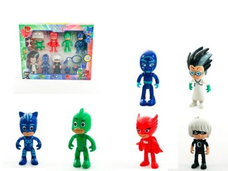 Набор состоит из 6 фигурок - персонажей мультфильма "Герои в масках". Фигурки детализированные, похожи на свои мультяшные прототипы. Высота - 10 см. С аксессуарами. Упаковка: Коробка Цвет: Разноцвет Вес в упаковке: 180 г Габариты в упаковке: 23 x 29,5 x 4,5 см Cтрана производитель: Китай Материал: Пластик Комплектация: 6 фигурок, аксессуары