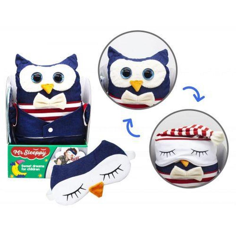 Игрушка-сплюшка "Сова". Милая плюшевая зверушка в забавном костюмчике порадует вашего малыша. Игрушка приятная на ощупь. С большими, яркими глазками, а во время сна, на игрушку можно одевать маску для сна (пришита к игрушке, ее можно поднимать или опускать на глаза). В наборе со сплюшей есть маска для сна с изображением мордочки животного. Выполнена из качественных и безопасных материалов. Упаковка: Коробка Цвет: Разноцветный Вес в упаковке: 580 г Габариты в упаковке: 14.5 x 26 x 33.5 см Cтрана производитель: Китай Материал: Комбинированный Комплектация: Игрушка, маска для сна