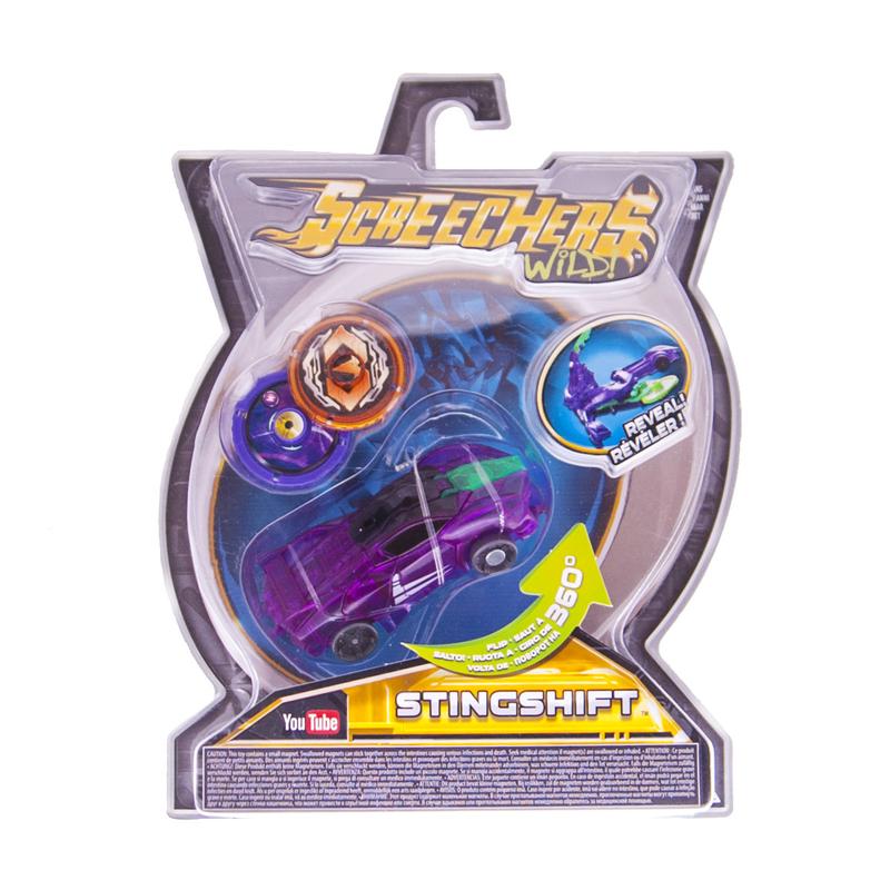 Машинка-трансформер SCREECHERS WILD!, упаковка - картонный планшет с блистером. В комплекте: 1 машинка, 2 диска. Особенности: машина умеет выполнять сальто на 360 градусов и трансформируется в дикого зверя прямо в воздухе. Необходимо запустить авто, направляя его на диск, или наоборот - запустить диск в машинку, и она при столкновении совершит переворот в воздухе и превратится в зверя. Чтобы трансформировать зверя назад, необходимо вытянуть диск и закрепить пружину внизу машины. Материалы: пластик, металл, магнит. Размеры машинки 8*2*3 см.