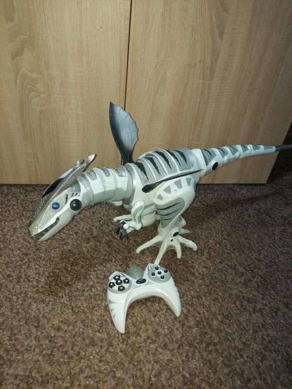 Стан самого робота идеален. Все функционирует, нужна замена батареек, стоял без дела. Имеется нюанс на самом пульте управления на кнопках (фото 5), но не влияет ни на что. Коробки не имеют. Радиоуправляемый Робот Robosaur TT320 (масштаб 1:4) - этот робот динозавр выполнит сорок функций. В зависимости от каждого режима, поведение робота меняется. Сенсоры касания, инфракрасного зрения и стереозвуковые сенсоры помогают роботу ориентироваться в пространстве. Питается от восьми пальчиковых батареек (АА) и еще три необходимо для пульта дистанционного управления. Пульт управления инфракрасный. В режиме самостоятельных действий рпозначей двигается самостоятельно, исследуя окружающие условия, если в течение 3 минут с ним не производятся никаких действия. В этом режиме робозавр обходит все препятствия, используя инфракрасные детекторы. Периодически он останавливается, проверяя слышит резкие, громкие звуки. Если прикоснуться к любому контактному датчику или нажать кнопку на пульте управления, динозавр выйдет из режима самостоятельного движения. Робозавр крутит головой, подтверждая, что он есть в режиме "Бадрый". В этом режиме робот использует свои инфракрасные и звуковые датчики для охраны территории вблизи него. Можно направлять робозавра, используя "лазерное" наведение. Поместите пульт управления спереди динозавра на расстоянии около 30 см от пола, и нажмите с удержанием кнопку "Включение "лазерного" наведения на цель. Голубой световой луч покажет, куда вы направляете Робозавра. Удерживайте кнопку, и робот будет двигаться световым лучом. Характеристики: возраст: от 8 лет; движение: вперед, назад, влево, вправо, повороты головы по часовой стрелке и против часовой стрелки, движения хвоста вправо и влево; питание 8 батареек типа AA (приобретаются отдельно); пульт ДУ: 3 батарейки типа AA (приобретаются отдельно); сенсоры инфракрасного зрения; сенсоры прикосновения к рту, к подбородку и хвосту; звуковые сенсоры; рвозозавр может двигаться по "лазерному" указателю с пульта ДУ; размер динозавра: 79х21х27 см;