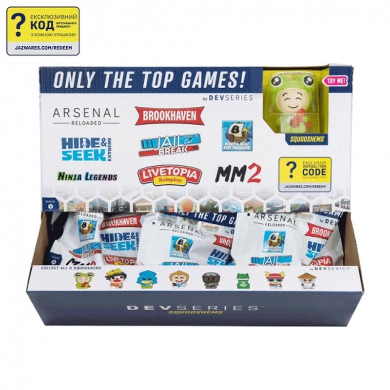 Ігрова фігурка-сквіш DevSeries Squooshems Blinds, в ас., S1 CRS0023 Хапайте та стискайте своїх улюблених ігрових персонажів DevSeries Squooshems. Упаковка повністю закрита, вміст прихований, котрий з героїв тапиться, сюрприз. Кожне паковання містить одну із восьми 6 сантиметрових сквішів, найвідоміших ігрових персонажів з топових Roblox ігор: Sparkplug із Brookhaven, Nikilis із Murder Mystery 2, SWAT Pass Gamer із Jailbreak, Froggy із Arsenal Reloaded, Zeg із Build A Boat For Treasure , Playground T-Rex із Livetopia, Ethan із Hide and Seek Extreme та Sensei із Ninja Legends. Кожен Squooshems виготовлено з м’якого матеріалу, який при стисканні змінює форму, що робить його ідеальним компаньйоном під час гри, або стане прикрасою вашого столу, книжкової полиці або ліжка. Також ігрові фігурки-сквіші у комплекті мають ексклюзивний віртуальний код предмета, який відкриває унікальний аксесуар для вашого Roblox аватара, доступний лише у DevSeries. Зберіть усі вісім улюблених персонажів Squooshem від DevSeries. Офіційно ліцензований продукт від Jazwares. Характеристики: - Висота фігурок - 6 см - Вікова категорія - 6 + - Матеріал - термопластична гума Комплектація: - Ігрова фігурка-сквіш - 1 шт., в асортименті - Ексклюзивний код для отримання предмету у грі «ROBLOX»