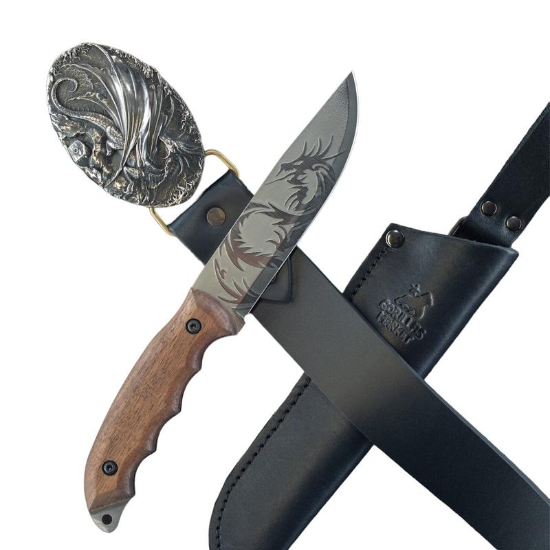 Подарунковий набір для справжніх чоловіків. Готове рішення для оригінального подарунка на усі випадки життя. Ручної роботи. Топ якості. Оригінальний дизайн. Натуральні матеріали Комплектація: 1. Ніж для виживання з художнім травленням 2. Чохол на ніж: Натуральна шкіра 3. Пряжка на ремінь: Нейзільбер 4. Ремінь: Натуральна шкіра (довжина 120см; ширина 40мм; товщина 3мм) 5. Подарункова коробка: Фанера 6. Наповнювач у коробці: Декоративне сіно Характеристики ножа: 1. Сталь марки 50х14мф 2. Фул-Танг (цілісно-металевий) 3. Накладки на гвинтах: матеріал Горіх 4. Загальна довжина: 250мм 5. Довжина клинка: 130мм 6. Товщина обуху: 2,7мм 7. Вага: 155г
