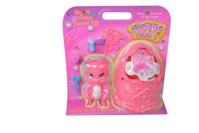 Малюк-динозавр з рожевою коляскою у формі яйця і необхідними для маленької дитини штучками: пляшкою, брязкальцем, гребінцем і соскою-пустушкою. Це класична іграшка для дівчинки: катати в колясці і всіляко доглядати за улюбленим вихованцем – основне заняття практично всіх дівчаток. Завдяки цьому ігровому набору можна придумати безліч цікавих і захоплюючих сюжетів для своєї гри. Ця фігурка дозволяє втілювати в життя найсміливіші мрії. Необмежена фантазія дає поштовх до відтворення величезної кількості різноманітних ігор. Оскільки цей ігровий набір не займає багато місця, його можна брати з собою в поїздки, на прогулянки, в садок. Під час гри розвивається дрібна моторика рук, уява і мислення. Іграшка виготовлена з пластмаси, рекомендується для гри дітям від 3 років.