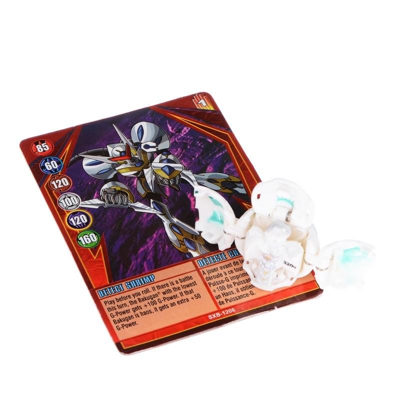 Бакуган - це іграшка, яка трансформується зі звичайної форми кулі або піраміди в різні істоти, такі як орел, дракон, коза, павук тощо. З бакуганом в наборі завжди є магнітна картка, за допомогою якої розкриваються всі функції і здібності монстра. У кожного бакугана є своя стихія, G-сила і характеристика. Також на картці зазначено кількість бонусних балів, які дитина може заробити під час гри. Ця гра є настільки популярною, що в багатьох країнах проводяться різні змагання і турніри. Завдяки своїй фантазії дитина може придумати безліч сюжетів для гри. Також щоб гра була веселіше, малюк може запросити до себе своїх друзів або рідних. На картці описи написані англійською мовою, а це сприяє запам'ятовуванню слів. Така гра також допомагає розвитку дрібної моторики рук, логічного і тактичного мислення, уяви і уважності. Карткова гра виготовлена з екологічно чистого пластику і рекомендована для гри дітям від 5 років. У комплект входять: бакуган - 1 шт; картка - 1 шт.