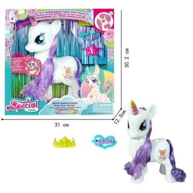 Игровой набор с милой пони-единорожкой. У лошадки роскошная длинная грива и хвост. Оснащена игрушка световыми и звуковыми еффектами: светится лампочка внутри игрушки, раздаеться звук топота копыт. Выполнена пони из очень прочной резины. В комплекте также есть диадема для лошадки и 2 заколочки. Размер пони: 28х15х9,5 см. Бренд: MIC Упаковка: Коробка Цвет: Разноцвет Тип эл-тов питания: Батарейки AG 13 Эл-ты питания в комплекте: Есть Вес в упаковке: 620 г Габариты в упаковке: 30 x 31 x 12.3 см Cтрана производитель: Китай Материал: Комбинированный Комплектация: Пони, аксессуары