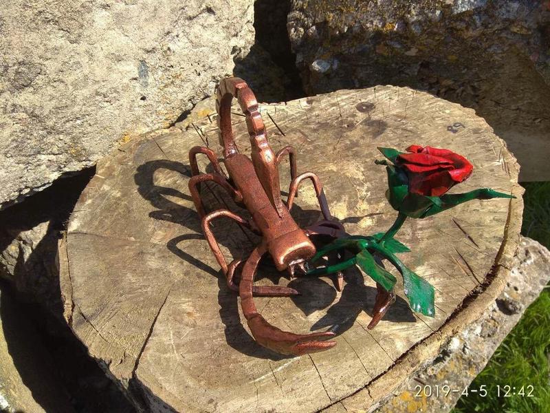 Вот кованый скорпион ручной работы, который держит красивую розу и украсит любое место в вашем доме. Размеры скорпиона: - Высота: 18 см - Длина: 25 см - Ширина: 16 см Цвет: черный, покрытый медной патиной, лакированный. Это произведение станет отличным подарком на свадьбу, годовщину свадьбы (железо, сталь), день рождения, День матери, День отца и другие важные события!