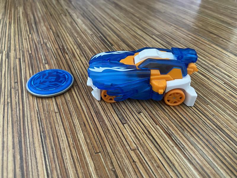 Машинка перетворюється на звіра, перевертаючись у повітрі на 360 градусів! Машинка розганяється, ловить спеціальний диск, робить перекид і самостійно трансформується прямо в повітрі. Зворотно в машинку іграшка збирається вручну.
