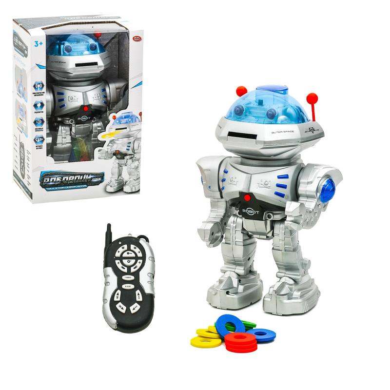 Іграшка "Робот-Страж", 30см, радіокерований. Музика, звуки, світло. Самостійно ходить та стріляє дисками. Живлення - батарейка. Упаковка - коробка. Розмір - 21,5х15,5х32 см.