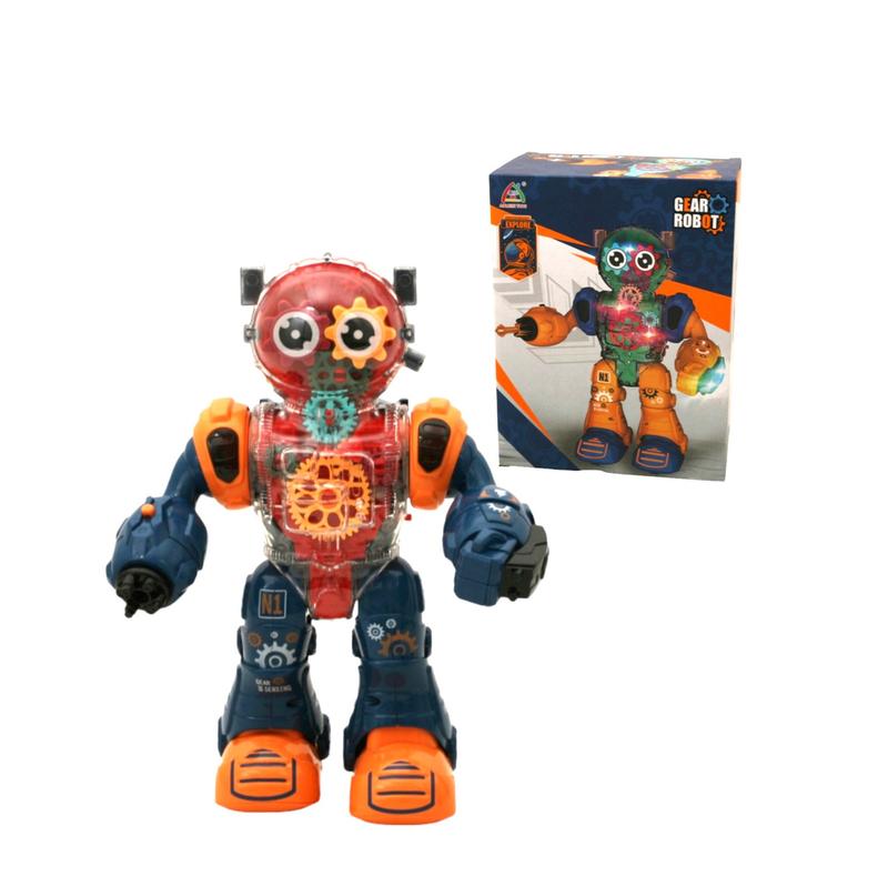 Іграшка "Робот", 25 см, 4 види. Самостійно рухається, стріляє. Є звукові та світлові ефекти. Прозорий корпус з кольоровими шестернями. Живлення - батарейки. Матеріал - пластик. Упаковка - коробка. Розмір - 19х11,5х25 см.
