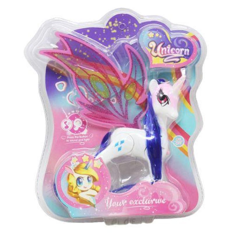 Мила конячка-поні буде чудовим подарунком. У конячки довга, шовковиста грива і хвіст, гарні прозорі крила, а також ріг, як у єдинорога. У іграшки є світлові та звукові ефекти (активуються при натисканні кнопки на грудях). Розмір конячки (без крил) – 15х12х4 см. Виконана з міцного пластику. Для дітей від 3-х років.