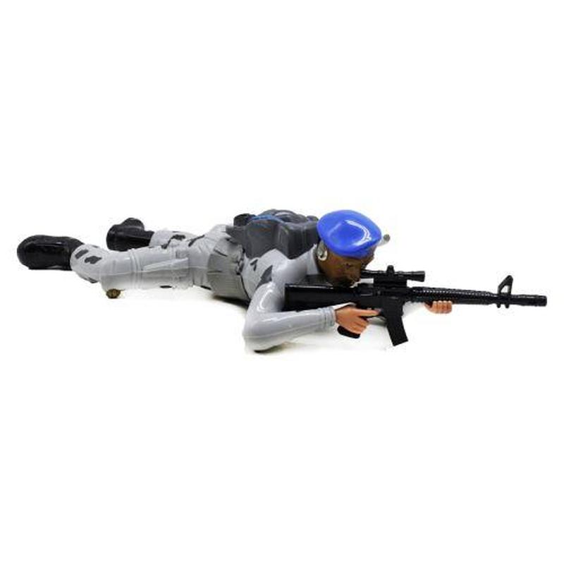 Оригінальна пластикова іграшка-солдат сподобається дитині. Іграшка працює на батарейках. Оснащена звуковими та світловими ефектами - звуки стрілянини, підсвічування дула та шолома. Солдат повзає по рівним поверхням, може долати невеликі перешкоди. Розмір іграшки 40х14 см. Також у наборі є маленька пластикова фігурка солдата та декорації – мішки з піском. Працює від 3-х батарейок типу АА (немає в комплекті).