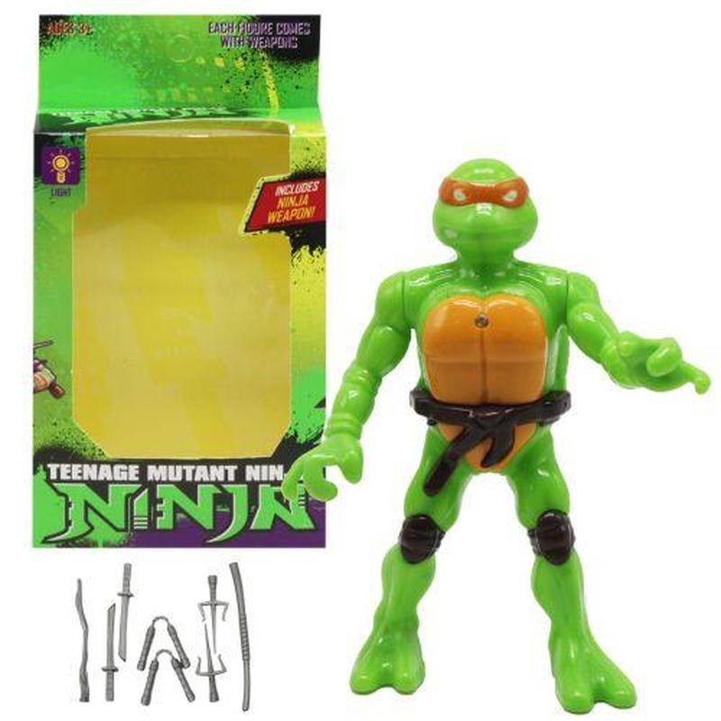 Пластикова фігурка у вигляді персонажа легендарного мультфільму "Черепашки ніндзя". Детальна, схожа на свого мультяшного прототипа. У героя рухливі руки. На спині кнопка, яка включає лампочку на грудях. Розмір фігурки – 12,5 х 8,5 см. У наборі комплект зброї всіх 4 черепашок.