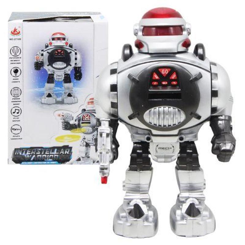 Робот на радиоуправлении "Interstellar Warrior". Ходит и скользит вперед и назад. Поворачивает влево и вправо. Есть функция "Танец", поднимает руку с оружием, стреляет мягкими дисками. Говорит фразы на английском языке. Имеет яркую подсветку. Размер робота - 30 см. Работает от 4-х батареек АА (нет в комплекте), пульт от 2-х батареек АА (нет в комплекте). Бренд: FENG YUAN Упаковка: Коробка Цвет: Серый Тип эл-тов питания: Батарейки (АА) Кол-во эл-тов питания: 6 Эл-ты питания в комплекте: Нет Вес в упаковке: 1060 г Габариты в упаковке: 21 x 32 x 14 см Cтрана производитель: Китай Материал: Пластик Комплектация: Робот, пульт, 12 дисков