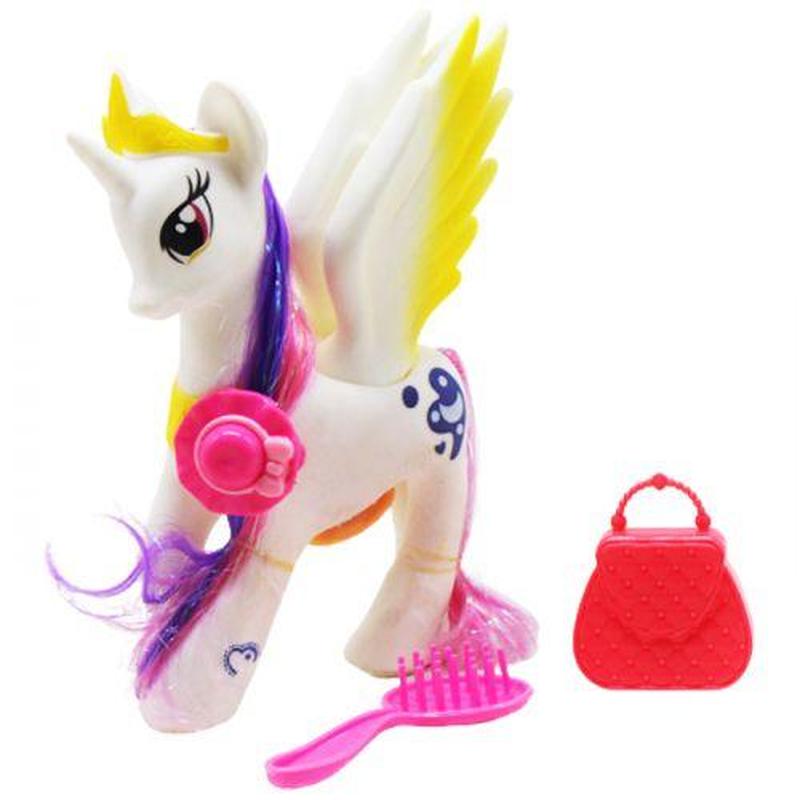 Фігурка чарівної єдиноріжки, виконаної у стилістиці популярного мультсеріалу "My little pony". Іграшка виконана з міцної гуми, голова та крила рухливі. Має світлові та звукові ефекти - при натисканні на кнопочку на животі, включається різнокольорове підсвічування та весела мелодія. У наборі також є різноманітні аксесуари для поні: шпилька, гребінець і сумочка. Бренд: MIC Упаковка: Пакет Колір: Білий Вага з упаковкою: 170 г Габарити в упаковці: 4 x 20 x 27 см Габарити без упаковки: 4 x 11 x 20 см Країна виробник: Китай Матеріал: Комбінований Комплектація: Фігурка, шпилька, сумочка, гребінець