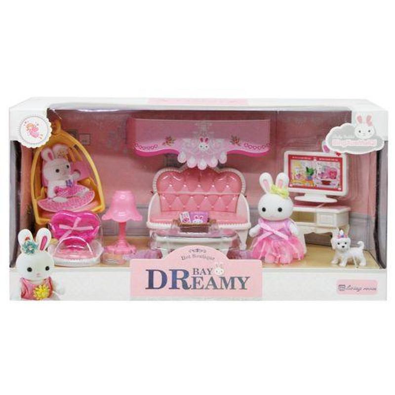 Лялькова кімнатка для кролика серії "Bay Dreamy". Укомплектована різноманітними елементами меблів: підвісне крісло, лампа, диван, столик, телевізор та стійка для нього, лежак для собачки. Також у наборі є мила флоксова фігурка у вигляді зайки та пластикова фігурка її вихованця - собачки. Меблі виконані з якісного пластику. Для дітей віком від 3-х років. Бренд: MIC Упаковка: Коробка Колір: Рожевий, білий Вага з упаковкою: 395 г Габарити в упаковці: 14 x 19 x 36 см Габарити без упаковки: 14 x 19 x 36 см Країна виробник: Китай Матеріал: Пластик Комплектація: Фігурка зайчика, фігурка собачки, крісло підвісне, лампа, диван, столик, телевізор, стійка для телевізора, лежак для собачки