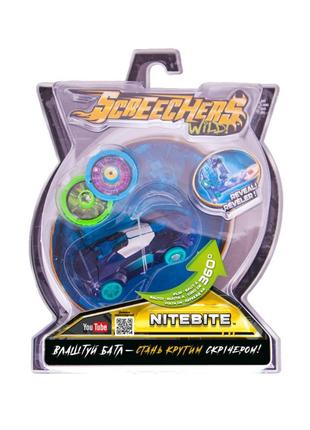 Screechers Wild! - це перші в історії машинки, які роблять сальто на 360 градусів і трансформуються в дикого звіра прямо в повітрі. Можеш собі таке уявити? Влаштовуй неймовірні пригоди, видовищні бої і фантастичні гонки! Кожен скрічер трансформується в тварину з супер силою, потрібно тільки запустити машинку направляючи її на магнітний диск або навпаки запустити диск в машинку, при зіткненні з яким вона зробить перекид в повітрі і перетвориться на звіра. Скрічер Найтбайт трансформується в крутого кажана Для того, щоб трансформувати тварину назад, потрібно витягти диск і закріпити пружинку знизу машини і ви знову можете вступати в бій. Диск має гладку поверхню для бездоганного ковзання і гумову поверхню для фіксації на місці. Випробуй свого скрічера, бийся за скрічер-паливо і перемагай! Машинка-трансформер Найтбайт має міцну конструкцію з надійними кріпленнями і виконана з високоякісного матеріалу. У наборі SCREECHERS WILD! L 1 - НАЙТБАЙТ: машинка 2 диска Саме час почати збирати всю колекцію Диких Скрічерів! Бери участь в баттлах - стань крутим скрічером! Шукай нові серії про пригоди скрічеров на Youtube. Рекомендовано для дітей від 6 років.