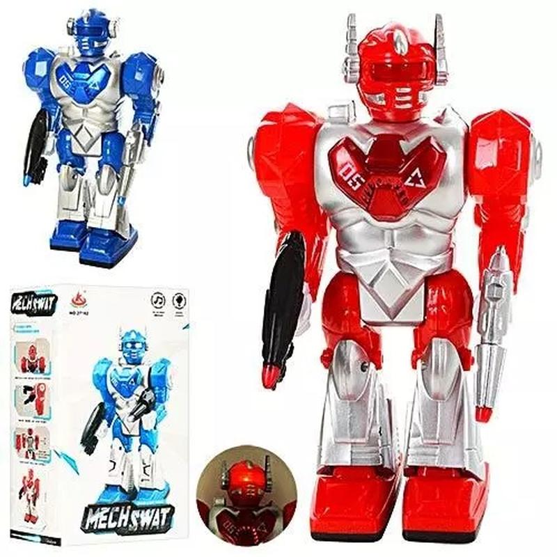 Робот на батар. 27162 2 цвета, с оружием, ходит, возвращает корпус, муз., мир., на батар., в коробке 22*13*7см
