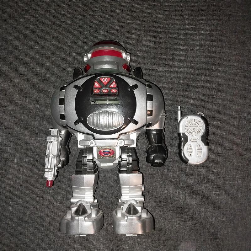 Робот, английская озвучка,стреляет дисками, звучащие и световые эффекты, на радиоуправлении.