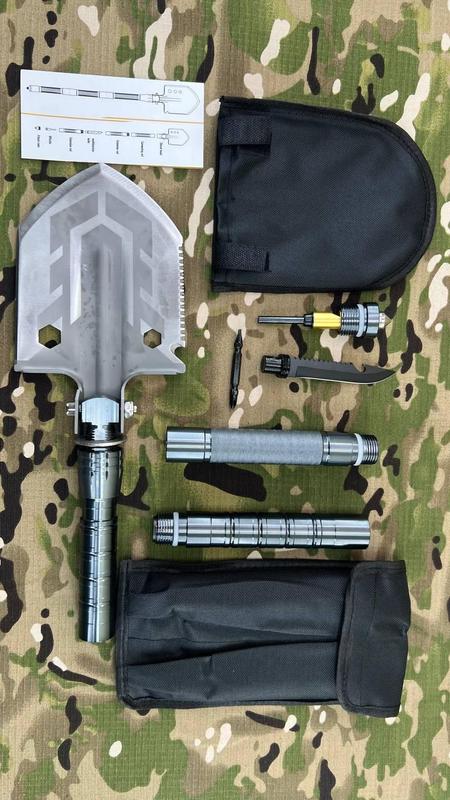 Тактична лопата — незамінна зброя в різних життєвих ситуаціях. Кожен чоловік повинен мати «Тривожний рюкзак», що містить найнеобхідніше для всіх випадків життя. Одним із таких потрібних предметів є похідна лопата мультитул 16-в-1. Характеристики: Країна виробник: Китай Загальна вага: 924 Довжина: 67 Стан: Новий Довжина рукоятки: 45 Тип рукоятки: Знімна Матеріал рукоятки: Нержавіюча сталь Матеріал робочої частини: Нержавіюча сталь Довжина робочої частини: 16.5 Ширина робочої частини: 13 Кількість у наборі інструментів, шт: 16 (лопата, мотика, викрутка, свисток, склобій, скребок, острог для риби, відкривалка, тактична біта, ручка для викрутки, кремінь
