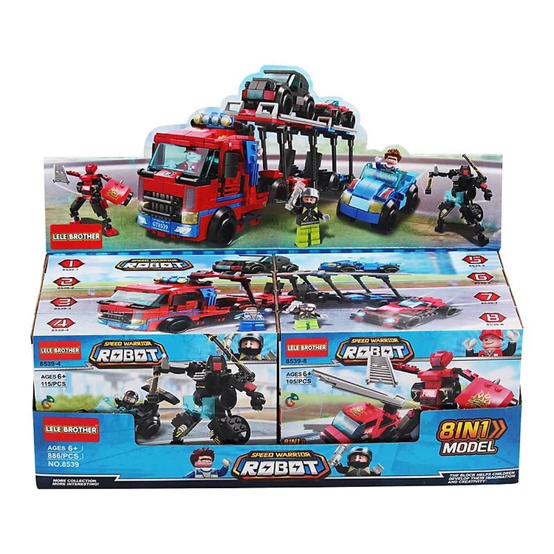 Конструктор "Машини та Роботи" LeleBrother 886 деталей серія Трансформери - це відмінний вибір і для подарунка, і для розвитку дитини. Ціна за 1 шт. У комплекті даного конструктора 8 коробочок з самостійною іграшкою, яка є машиною, яка може ставати роботом, тобто. у кожній з 8ми коробочок конструктор 2 в 1. З комплекту в 8 коробочок збирається величезна вантажівка - автовоз з машинками. Інструкція зі складання в комплекті, барвиста та зрозуміла для цікавого складання та добре проведеного часу. 8539-1 синя машина / робот 123 деталі 8539-2 синя машина/робот 106 деталей 8539-3 чорний тягач/робот 105 деталей 8539-4 чорна машина/робот 115 деталей 8539-5 червона машина/робот 111 деталей 8539-6 червона машина/робот 114 деталей 8539-7 червона машина/робот 107 деталей 8539-8 червона машина зі сходами/робот 105 деталей Можливість відтворювати неповторний ігровий світ, не вдаючись до використання комп'ютера, дозволяє розвинути уяву дитини, а також стимулює розвиток дрібної моторики. Процес будівництва з барвистих блоків конструктора дуже цікавий, у дитини з'являється можливість для творчості. Також це розвиває логічне мислення, вчить його зосереджуватися та концентруватися на поставленому завданні. Для дітей та дорослих стане чудовим способом спільного проведення часу, адже збирати конструктор разом – це дуже цікаво. Складання обіцяє бути цікавою, а гра захоплюючою. Для дітей від 6 років.