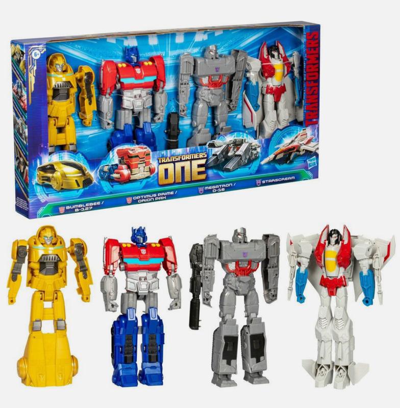 ІГРАШКИ-ТРАНСФОРМЕРИ 2-В-1, НАТХНЕННІ ФІЛЬМОМ: Натхненний фільмом "Трансформери-1", цей мультипак містить 4 фігурки Трансформерів для чудової гри 2-в-1. •ФІГУРКА ОПТИМУСА ПРАЙМА/ОРІОНА ПАКС: 28-сантиметрова фігурка Трансформерів Оптимуса Прайма/Оріона Пакса може перетворитися з робота на кібертронський вантажівку за 7 простих кроків. •ФІГУРКА МЕГАТРОН-D-16: 28-сантиметрова фігурка Трансформерів Мегатрон/D-16 може перетворитися з робота на кібертронський танк за 6 простих кроків. •ФІГУРКА БАМБЛБІ/B-127: 28-сантиметрова фігурка Трансформерів Бамблбі/B-127 може перетворитися з робота на спортивний автомобіль Кібертронського штурмовика за 3 простих кроки. •ФІГУРКА СТАРСКРІМ: 28-сантиметрова фігурка Трансформерів Старскрім. Фігурка може перетворитися з іграшкового робота на кібертронський реактивний літак за 6 простих кроків • УЛЮБЛЕНІ ПЕРСОНАЖІ З "ТРАНСФОРМЕРИ-ОДИН": Пориньте додому в атмосферу екшену та захопливих моментів фільму з цим набором фігурок Трансформерів. Чудовий подарунок для хлопчиків та дівчаток віком від 6 років, які люблять іграшкових роботів • СТАНЕ ЧУДОВИМ СВЯТКОВИМ ПОДАРУНКОМ: Цей багатокомпонентний набір іграшкових роботів стане ідеальним різдвяним подарунком для хлопчиків та дівчаток. Веселий святковий подарунок для дітей, які є шанувальниками Трансформерів