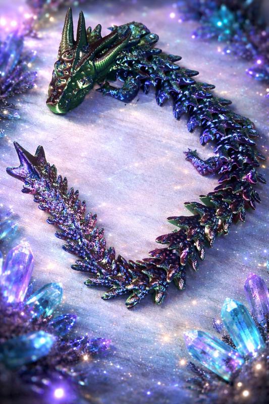 Ефектний декоративний дракон з магічними переливами синього, зеленого та фіолетового металевих відтінків. Колір змінюється залежно від освітлення, створюючи неймовірний візуальний ефект ✨ 🐉 Висока деталізація — чітко опрацьовані луски, голова та вигини тіла 🌈 Іридисцентне покриття (хамелеон) — виглядає стильно та дорого 🖐 Гнучка, рухома конструкція — можна змінювати положення фігурки 🎁 Ідеально підійде для: • подарунка • декору інтер’єру • колекції у стилі фентезі • фотосесій та вітрин 📐 Матеріал: міцний пластик (3D-друк)