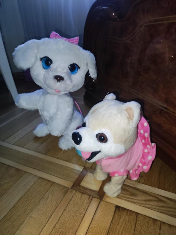 на фото две собачки цена указана при одном белом щенке интерактивная игрушка Fur Real Friends Щенок осуществит мечту вашего ребенка о домашнем любимце! Белая собачка отправится с малышом на веселую прогулку, сможет развлечь его, заставить плясать под радостные мелодии и полюбить нежный дизайн игрушки. Девочки и мальчики будут в восторге от нового друга. Особенности: собачка проигрывает 5 мелодий, под которые будет очень весело танцевать; у белого щенка есть более 50 звуков и реакций; поводок имеет несколько кнопок, которые активируют реакции игрушки; есть танцевальная кнопка на поводке — если ее нажать, то собачка продемонстрирует свои особые движения для танцев; также есть прогулочная кнопка на поводке — она активирует другой режим, в котором пушистый щенок будет гулять, качая головой, радостно лая и выдавая милые щенячьи звуки; милый дизайн игрушки в белом цвете с милым розовым бантиком. Питание: 4 батарейки типа AA Материал: плюш. маленький бежевый щенок умеет ходить и гавкать работает от батареек отдам за 200