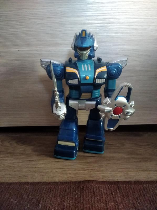 На батарейках, светиться, шагает, крутиться. Высота 25см. В хорошем состоянии, играл мой сын.