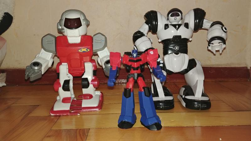 Внешне в нормальном состоянии. У самого маленького робота шевелятся только руки. У бело-черного не хватает "клешни", просто робот, без функций(раньше работал от батареек)
