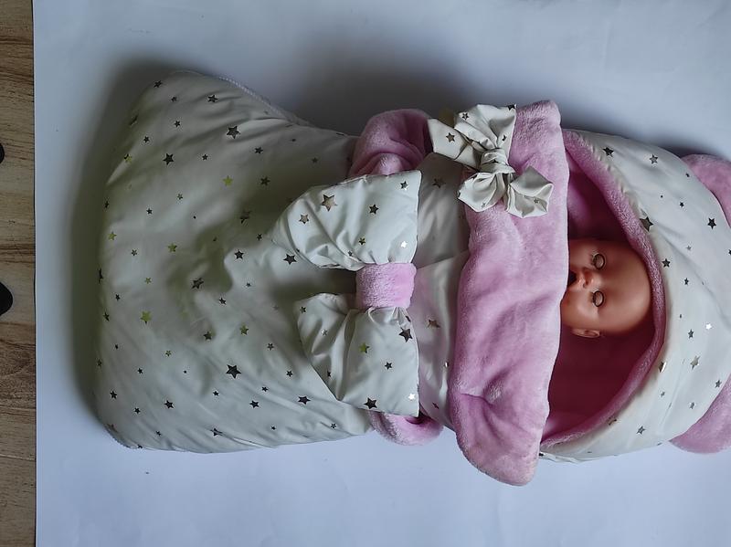 Гарний, теплий зимовий конверт для новонародженої дівчинки. Комфортний спальний мішок для довготривалих прогулянок. Вистачить на всю зиму. До 4-6 місяців, конверт зроблений під розмір коляски. Стан нового. Бант - на резинці знімається верхня частина на двох блискавках, повністю від'єднується. На плед не перетворюється. Зовні плащівка – водонепроникна. Усередині махра, синтепон 4см розмір 72*42 см. Виробництво - Україна на фото лялька розміром як справжне немовля