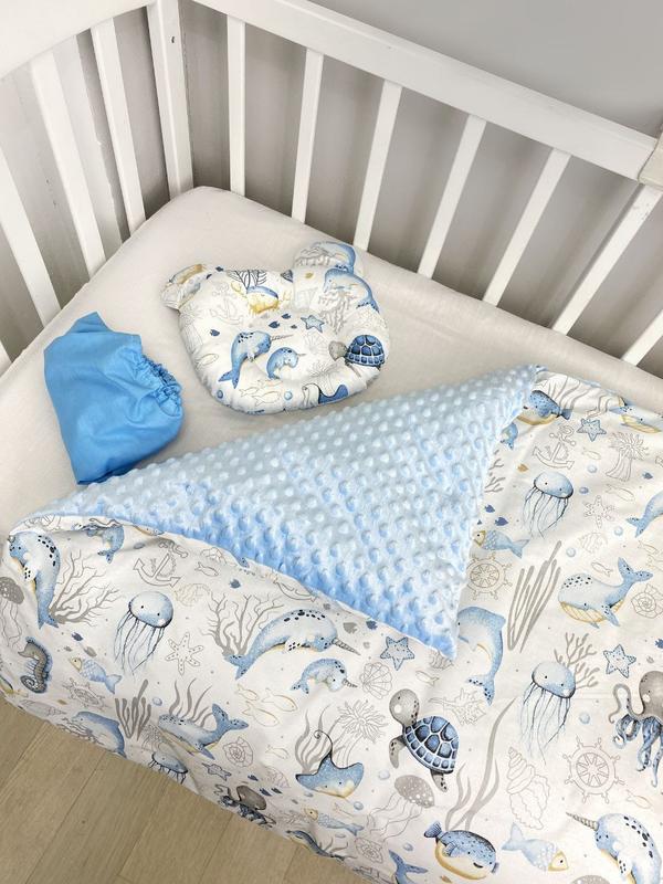 Файный наборчик в коляску: - Одеяло со съемным утеплителем и мягконьким плюшем, 100×80см, - Простынь в люльке с резинкой по периметру, подходит на матрасики до 40×88см, - Ортопедическая подушка с ушками.