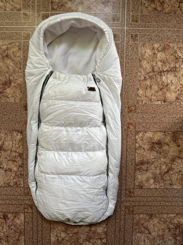 Теплый зимний кокон Цвет: насыщенный белый Размер: Длина -80 см Ширина -40 см (ориентивно до 9 месяцев) Без дефектов,пят В использовании был лишь пару раз Все замочки в работающем состоянии Распашонкается до состояния одеяла