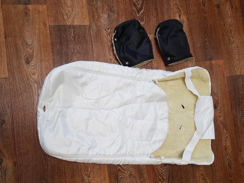 в состоянии нового конверта и 2 муфта в виде перчаток для детской коляски. Очень теплый. конверт с прорезями для ремней безопасности