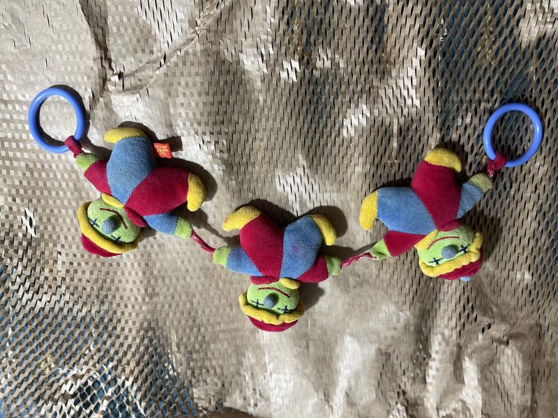 гарна підвіска на коляску або на ліжечко в суперовому стані. дитині дуже подобається гратися. Мʼякі клоуни коли на них нажимаєш видають звук . Легко прати