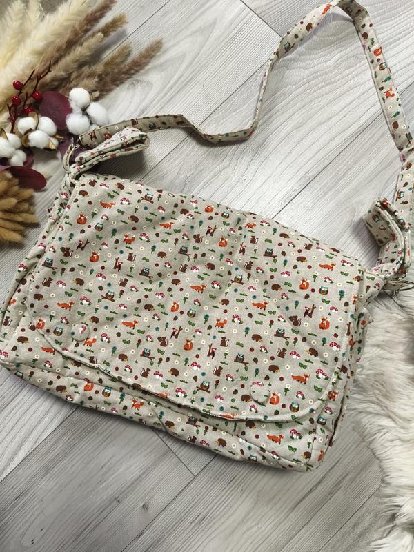 Оригинальная сумка из натуральной ткани для детской тележки в бежевом цвете с лесными зверьками Содержимое, с большим количеством карманов: снаружи по бокам 2 кармана с резинкой для бутилочки, 2 кармана сзади сумки. внутри на клапане большой карман на замочке, внутри сумки 1 основной отдел и 4 боковых кармашка для мелочи. Размеры: 46х32х11см новая, не использовалась нюанс: внутри сумки на шине подкладка 5см не прошитая (фото 9,10) заказ по минимальной плате 200грн, оплата на карту, также можете оформлять безопасную доставку💌