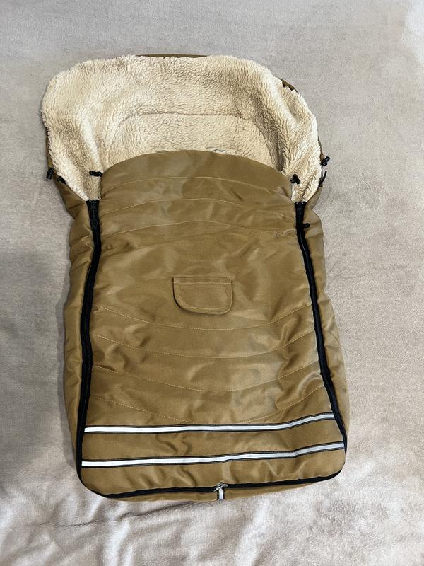 Конверт у візок дуже теплий, не боїться прання. Прорізи робила суто під свій візок у відповідних місцях, спереду теж є місце для прорізу для ременів безпеки. Також можна використовувати на санчатах. В комплекті дві теплі рукавички на ручку візка для мами. На ніжках світло відбивна полоска