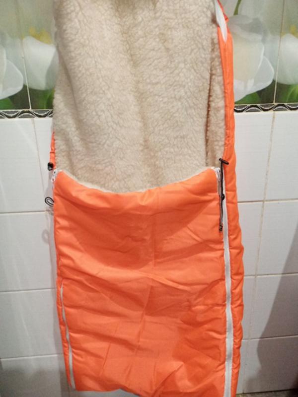 Из водоотталкивающей ткани. Яркий цвет.Крепление об спинку санок.На двох замках по боках. Верх можно стянуть.