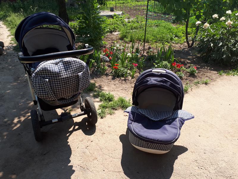Детская коляска 2в1 темно-синего цвета, полностью функционирует, тормоза работают, колеса новые. недостатки на фото.