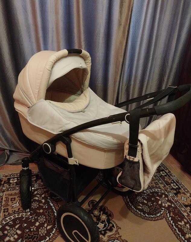 колір бежевий витримує 10кг в хорошому стані на амортизаторах наявна і зимова корзина з усим необхідним - витримує 22кг знизу є вмістка корзина тканина розглажується, просто довго лежала складеною передні колеса обертаються на 360° і фіксуються в одному напрямку тормоза працюють