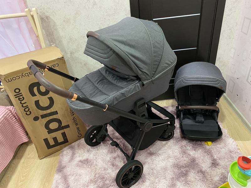 Carello Epica Купили в 2023 году, в использовании была год. Есть коробка из коляски В комплекте: дождевик, сетка, и чехол на ножки. Ткань не выгорела, коляска очень маневренна. Из дефектов: на шасси есть царапины.