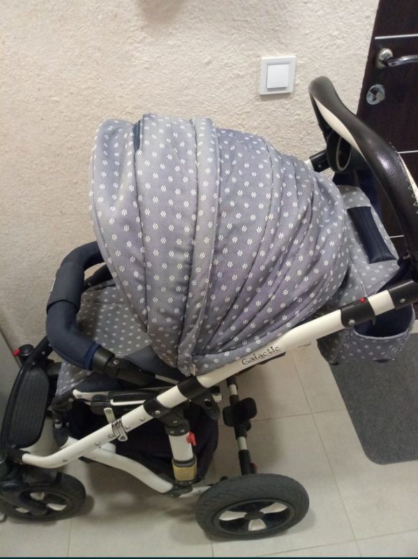 Универсальная коляска 2 в 1 Adamex Galactic, цвет серо-синий джинс в геометрические цветочки. Состояние очень хорошее после двух детей. Имеется нюансы не работает тормоз (потребуется замена толкатель тормозного штыря пластиковый) и требует замены камера заднего правого колеса. Вказала на останньому фото. Комплектация: -люлька(в идеальном состоянии), -прогулочный блок, -сумка -антимоскитная сетка, подстаканник, -муфточки-рукавички. Польский производитель, надежная, уютная, легко преодолевает бордюры, благодаря большим колесам зимой прекрасно едет по снегу. Положение ручки регулируется. В хорошем состоянии, все чехлы снимаются и прекрасно стираются. За все время была замена камер на колесах, и замена механизмов складывания рамы коляски. Самовизизиз Киев Тротизна!