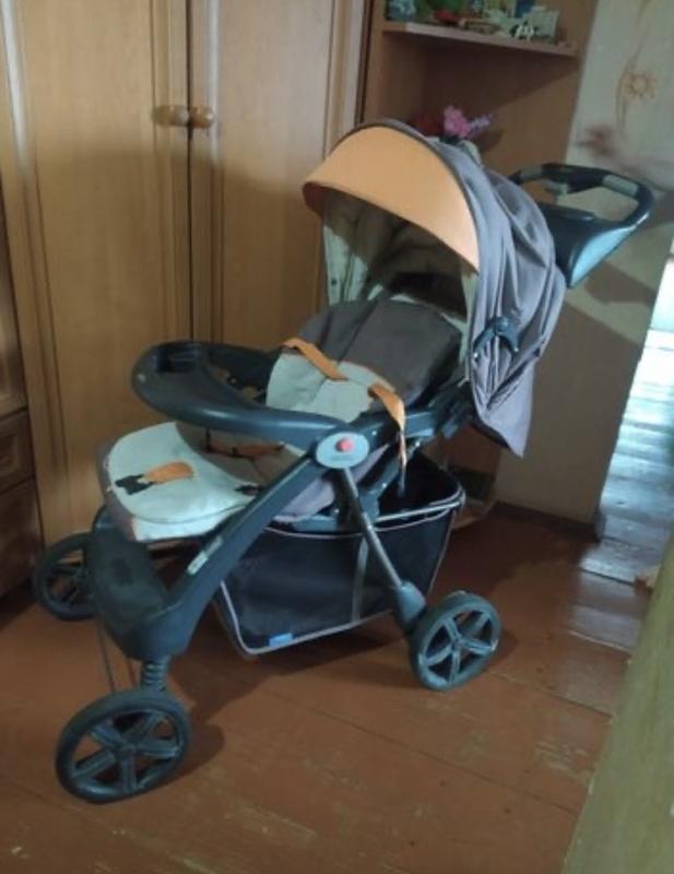 Три положения спинки, полное раскладывание; ремни безопасности; удобная родительская ручка со столиком; детский столик с подстаканником; вместительная корзина для детских вещей и покупок; чехол для ног, чехол от дождя. Коляска в красивом состоянии без поломок.