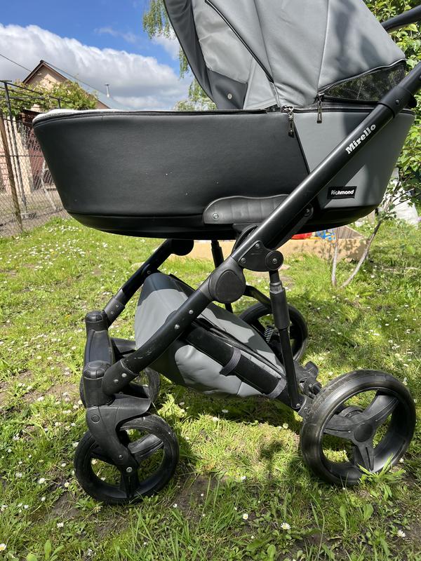 Знімна оббивка з 100% бавовни, Оббивка комбінована (тканина / еко-шкіра), Регульований підголівник, Капюшон з вентильованим віконцем, Ручка для перенесення люльки в верхній частині капюшона, захована за блискавкою, Накидка-чохол на люльку зроблена на блискавки: надійно і дуже зручно, Кокосовий матрацик для новонародженого в комплекті. Особливості прогулянкового блоку Richmond Mirello: Капюшон з розширенням для максимального захисту, Знімний захисний бампер, і роздільник для ніжок, П'єр ятиточкові ремені з м'яким якими накладками, Регульована підніжка з знімним чохлом, Спинка регулюється до повністю горизонтального положення. Шасі: Алюмінієва рама, Складаються книжкою, Гелеві колеса, Передні колеса поворотні з блокуванням, Текстильна корзина для покупок на блискавці, Ножні гальма, М'яка амортизація рамі з можливістю зміни жорсткості амортизації, Ручка обтягнута еко-шкірою, регулюється. Комплектація: Дощовик, Москітна сітка, Сумка для мами, Кокосовий матрацик. Є один нюанс в прогулянковому блоці 14000+ торг
