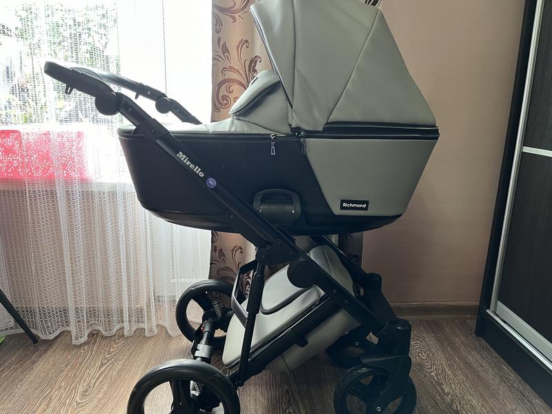 ляскаб/у 4+з 5 дуже в хорошому стані прогулянкова зовсім нова,люлькою користувалась лише 4 місяці Коляска 2 в 1 Richmond Mirello новинка від польського виробника, виконана в сучасному стилі і відноситься до модульних колясок. Для немовлят підійде затишна люлька, для діток старшого віку - прогулянковий блок, блоки легко і швидко встановлюються на раму за допомогою адаптерів. Рама даної моделі виготовлена з алюмінію, що дозволяє знизити загальну вагу конструкції. Люлька для новонародженого має повністю бавовняну внутрішню оббивку і додатково комплектується ортопедичним матрацом з кокосовим наповнювачем, розроблений з урахуванням всіх особливостей анатомії новонароджених дітей. У люльці є підголівник з можливістю регулювання положення дитини лежачи або напівлежачи. Капюшон має вентиляційне віконце на блискавці, для провітрювання і безшумний механізм опускання. На чохлі люльки є високий борт з відворотом, який захистить дитину від вітру, дощу чи сонця. Капюшон і чохол надійно кріпляться до основи люльки за допомогою блискавок. З 6-ти місяців на тій же рамі встановлюється прогулянковий блок, який має кілька положень нахилу спинки аж до горизонтального, і оснащений зручним вкладишем з 5-точковою системою ременів безпеки. Підніжка регулюється і має тканинний чохол на блискавці з можливістю зняття. Капюшон обладнаний додатковою секцією для максимального опускання і легко регулюється за допомогою одночасного натискання кнопок з боків. Паховий утримувач і бампер, виконаний з еко-шкіри. Чохол на ніжки кріпиться до прогулянкового блоку кнопками, так само має відворот в верхній частині для захисту від вітру та снігу. Шасі коляски доповнюють практичні гелеві колеса, які не треба підкачувати. Поворотний механізм передніх коліс з блокуванням дозволяє зробити Richmond Mirello максимально маневреною і більш мобільною. На рамі внизу розташоване центральне гальмо. Вдосконалені задні амортизатори захищають коляску від трясіння. Якщо вам потрібно з'їхати з рівного асфальту на гравій і при цьому не розбудити малюка, ви зможете швидко перенастроювати жорсткість амортизації, якою зручно користуватися практично на ходу. На рамі розташовується містка нижня сумка закритого типу, яка закривається за допомогою блискавки. Ручка, виконана з еко-шкіри і легко регулюється за допомогою кнопок. Верхню сумку для необхідних дрібниць мама може пристібати до коляски або носити у вигляді рюкзачка. Особливості люльки моделі: знімна оббивка з 100% бавовни, оббивка комбінована (тканина/еко-шкіра), регульований підголівник, капюшон з вентильованим віконцем, ручка для перенесення люльки у верхній частині капюшона, захована за блискавкою, накидка-чохол на люльку зроблена на блискавці: надійно і дуже зручно кокосовий матрацик для новонародженого в комплекті. Особливості прогулянкового блоку Richmond Mirello: капюшон з розширенням для максимального захисту, знімний захисний бампер, і роздільник для ніжок, п'ятиточкові ремені з м'якими накладками, регульована підніжка із знімним чохлом, спинка регулюється до повністю горизонтального положення. Шасі: алюмінієва рама, складаються книжкою, гелеві колеса, передні колеса поворотні з блокуванням, текстильна корзина для покупок на блискавці, ножне гальмо, м'яка амортизація рами з можливістю зміни жорсткості амортизації, ручка обтяг