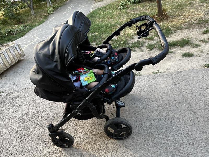 Коляска для двійні, в комплекті є дві люльки, дві прогулки, сумки, дощьовики, москітна сітка, підстаканник, є деякі нюанси із станом ручки коляски, більше фото надам в особисті. Також для люльок є простині, дві які були в користуванні і ще 2 нові, 9500 грн, можливий торг