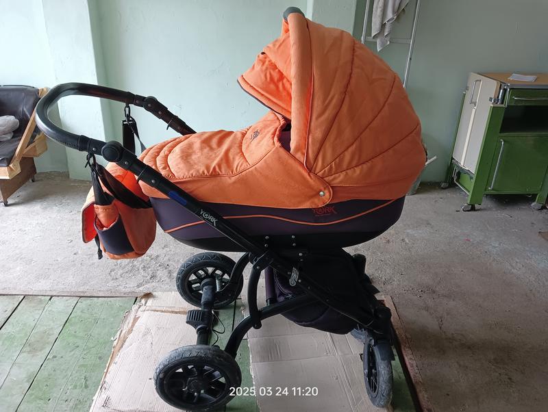 Коляска 2в1 оранжевая с серым в очень хорошем состоянии. Люлька имеет бортики и матрасик. Имеется весь текстиль на люльку и проулку. Прогулочный блок не использовали.
