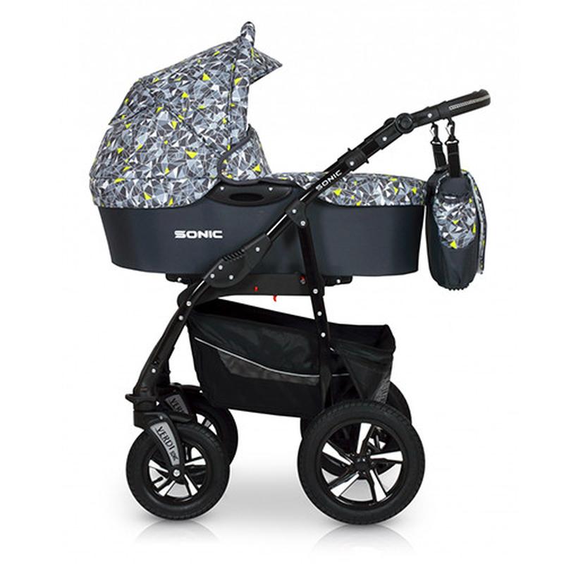 Коляска польського виробника Verdi серії Sonic зроблена по Євро стандартам. Її ключовими особливостями є легкість, комфорт, маневреність (вона проходить практично в будь-якому вузькому приміщенні) і звичайно ж ціна. Коляска Verdi Sonic має величезну кількість кольорів. Тканина коляски водовідштовхувальна, накидка легко знімається. Ручка для мами і переносна ручка люльки оббита еко- шкірою, вона приємна на дотик. На задній частині капора розташовується вікно з москітною сіткою для надходження свіжого повітря малюкові. Його зручно відкривати, немає ніяких блискавок, замків. Внутрішня оббивка Verdi Sonic зроблена з натуральних матеріалів, легко знімається для прання. У комплекті йде так само матрацик. У люльки регулюється підголівник, який можна встановити регулятором в будь-яке зручне для Вас положення. Крім центральної ручки перенесення в цій моделі є бічні ручки, вони представлені далеко не у всіх виробників. СумкаУ комплекті з коляскою Verdi Sonic йде практична та зручна сумка. У нижній частині розташовуються гумові підкладки щоб сумку можна було поставити на тверде або брудне покриття і при цьому вона залишилася чистою. Виконана сумка з вологовідштовхувального матеріалу, з боків 2 кишені для пляшок, що теж дуже зручно. У комплекті йдуть дощовик, москітна сітка і перехідники, для того щоб встановити на коляску автолюльку. Прогулянковий блокПісля того як Вашій дитині виповнилося пів року, або малюк вже навчився сидіти, саме час встановлювати замість люльки прогулянковий блок. Бажано до року розташовувати його обличчям до себе, після року обличчям до навколишнього світу. Як в колисці, так і в прогулянковому блоці вся тканина водовідштовхувальна. Накидка дуже легко знімається, капюшон опускається механічно, він є знімним. Для того щоб зняти, необхідно натиснути на затиск одночасно з двох сторін. Розглянемо прогулянковий блок Verdi Sonic окремо. Захисна м'яка подушечка для голови дитини, щоб при раптовому гальмуванні вона не пошкодила голову. П'ятиточкові ремені легко розстібати натисненням однієї кнопки. Підніжка має 5 положень, вона піднімається без додаткових зусиль, для того щоб опустити, необхідно затиснути кнопки з боків, вона сама опуститься вниз. Варто звернути увагу, що москітна сітка вже вшита, і дитині не будуть заважати комахи. Коли Ваша дитина втомився, прогулянковий блок з сидячого положення легко трансформується в горизонтальне положення для відпочинку, для цього необхідно опустити спинку і підняти підніжку. За необхідності можна опустити або підняти капюшон. АвтолюлькаІснує 2 способи установки автолюльки на раму Verdi Sonic. 1. Поставити перехідники, які йдуть в комплектації, а на перехідники вже встановити безпосередньо автолюльку. 2. Прикріпити перехідники спершу до автолюльки, а потім вже вставити їх в раму. У колясці Verdi Sonic так само є 5 точкові ремені, які розстібаються одним натисканням кнопки. Капор регулюється, на задній частині є 2 червоні кнопки. Для того щоб зняти перехідники з автолюльки, необхідно потягнути за важіль біля фіксаторів на себе. Ручка коляски зроблена з еко-шкіри, приємна на дотик і руки не ковзають. Для того щоб відрегулювати її по необхідному рівню, збоку на вигині є кнопка по обидва боки, натискаєте і виставляєте потрібну висоту. Колеса Передні колеса надувні, поворотні. Головна особливість надувних коліс, це 