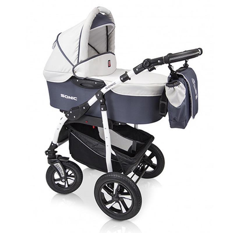 Коляска польського виробника Verdi серії Sonic зроблена по Євро стандартам. Її ключовими особливостями є легкість, комфорт, маневреність (вона проходить практично в будь-якому вузькому приміщенні) і звичайно ж ціна. Коляска Verdi Sonic має величезну кількість кольорів. Тканина коляски водовідштовхувальна, накидка легко знімається. Ручка для мами і переносна ручка люльки оббита еко- шкірою, вона приємна на дотик. На задній частині капора розташовується вікно з москітною сіткою для надходження свіжого повітря малюкові. Його зручно відкривати, немає ніяких блискавок, замків. Внутрішня оббивка Verdi Sonic зроблена з натуральних матеріалів, легко знімається для прання. У комплекті йде так само матрацик. У люльки регулюється підголівник, який можна встановити регулятором в будь-яке зручне для Вас положення. Крім центральної ручки перенесення в цій моделі є бічні ручки, вони представлені далеко не у всіх виробників. СумкаУ комплекті з коляскою Verdi Sonic йде практична та зручна сумка. У нижній частині розташовуються гумові підкладки щоб сумку можна було поставити на тверде або брудне покриття і при цьому вона залишилася чистою. Виконана сумка з вологовідштовхувального матеріалу, з боків 2 кишені для пляшок, що теж дуже зручно. У комплекті йдуть дощовик, москітна сітка і перехідники, для того щоб встановити на коляску автолюльку. Прогулянковий блокПісля того як Вашій дитині виповнилося пів року, або малюк вже навчився сидіти, саме час встановлювати замість люльки прогулянковий блок. Бажано до року розташовувати його обличчям до себе, після року обличчям до навколишнього світу. Як в колисці, так і в прогулянковому блоці вся тканина водовідштовхувальна. Накидка дуже легко знімається, капюшон опускається механічно, він є знімним. Для того щоб зняти, необхідно натиснути на затиск одночасно з двох сторін. Розглянемо прогулянковий блок Verdi Sonic окремо. Захисна м'яка подушечка для голови дитини, щоб при раптовому гальмуванні вона не пошкодила голову. П'ятиточкові ремені легко розстібати натисненням однієї кнопки. Підніжка має 5 положень, вона піднімається без додаткових зусиль, для того щоб опустити, необхідно затиснути кнопки з боків, вона сама опуститься вниз. Варто звернути увагу, що москітна сітка вже вшита, і дитині не будуть заважати комахи. Коли Ваша дитина втомився, прогулянковий блок з сидячого положення легко трансформується в горизонтальне положення для відпочинку, для цього необхідно опустити спинку і підняти підніжку. За необхідності можна опустити або підняти капюшон. АвтолюлькаІснує 2 способи установки автолюльки на раму Verdi Sonic. 1. Поставити перехідники, які йдуть в комплектації, а на перехідники вже встановити безпосередньо автолюльку. 2. Прикріпити перехідники спершу до автолюльки, а потім вже вставити їх в раму. У колясці Verdi Sonic так само є 5 точкові ремені, які розстібаються одним натисканням кнопки. Капор регулюється, на задній частині є 2 червоні кнопки. Для того щоб зняти перехідники з автолюльки, необхідно потягнути за важіль біля фіксаторів на себе. Ручка коляски зроблена з еко-шкіри, приємна на дотик і руки не ковзають. Для того щоб відрегулювати її по необхідному рівню, збоку на вигині є кнопка по обидва боки, натискаєте і виставляєте потрібну висоту. Колеса Передні колеса надувні, поворотні. Головна особливість надувних коліс, це 